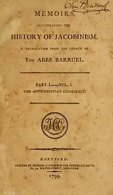 Abbé Augustin Barruel (1741–1820) became a Jesuit in 1756 but by 1762 anti-Jesuit feeling in France had become so strong that he left and travelled for many years, returning only in 1773.[4] The events of the French Revolution in 1792 caused him to leave again and take refuge in England. His dislike and hostility towards the philosophers was well known and well developed before 1789 as he had been on the editorial staff of the popular anti-philosophy literary journal Année littéraire decades before the Revolution.[5] In 1797, when living in exile in London, he wrote the Memoirs. It was published in French by the French publishing company at 128 Wardour Street, Oxford Street, London.[6] An English edition was issued the same year, and the work quickly became a commercial success.[7] The multi-volume work went through four revised French editions by 1799 and was translated into English, German, Italian, Spanish, Swedish, and Russian as editions were issued in London, Hamburg, Augsburg, Luxembourg, St. Petersburg, Dublin, Naples and Rome before the fall of Napoleon.[8]