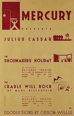 ![]() Poster for the Mercury Theatre's three spring 1938 productions—Caesar, The Shoemaker's Holiday and The Cradle Will Rock—running simultaneously in two Broadway theaters | |