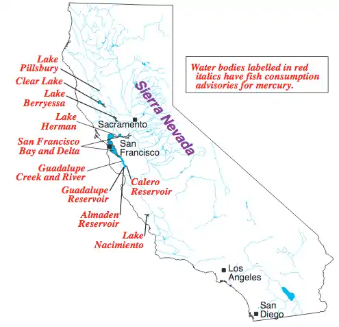 Areas in California with fish consumption advisories due to mercury contamination.[14]