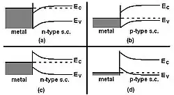 Band diagram of the band-bending at the interface of (a) a low work function metal and n-type semiconductor, (b) a low work function metal and a p-type semi conductor, (c) a high work function metal and an n-type semi conductor, (d) a high work function metal and a p-type semi conductor. (Figure adapted from H. Luth's Solid Surfaces, Interfaces, and Thin Films, p. 384.[1])