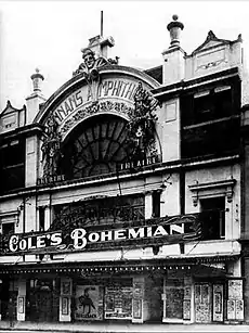 In 1911 the Queensland based architects Eaton & Bates, in association with the Melbourne architect Nahum Barnet, were commissioned to design a new theatre for the site for James Brennan. The design had seating on three levels and a large proscenium with curtains of gold. The front section included some rooms on the upper floors known as the Pastoral Hotel.[2] It opened in April 1912 as Brennans Amphitheater.