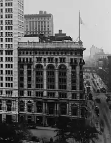 At the time, life insurance companies generally had their own buildings for their offices and branch locations. According to architectural writer Kenneth Gibbs, these buildings allowed each individual company to instill "not only its name but also a favorable impression of its operations" in the general public.[80][81] This had been a trend since 1870,[81][82] with the completion of the former Equitable Life Building in Manhattan's Financial District.[81][83] Furthermore, life insurance companies of the late 19th and early 20th centuries generally built massive buildings to fit their large clerical and records-keeping staff.[77]