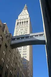 The tower (center) seen from below with clock faces; the east wing is to the right, and the New York Merchandise Mart (far left) and Metropolitan Life North Building (near left) can also be seen