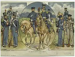 The war was fought by regiments of regulars and various regiments, battalions, and companies of volunteers from the different states of the Union as well as Americans and some Mexicans in California and New Mexico. On the West Coast, the U.S. Navy fielded a battalion of sailors, in an attempt to recapture Los Angeles.[59] Although the U.S. Army and Navy were not large at the outbreak of the war, the officers were generally well trained and the numbers of enlisted men fairly large compared to Mexico's. At the beginning of the war, the U.S. Army had eight regiments of infantry (three battalions each), four artillery regiments and three mounted regiments (two dragoons, one of mounted rifles). These regiments were supplemented by 10 new regiments (nine of infantry and one of cavalry) raised for one year of service by the act of Congress from February 11, 1847.[60] A large portion of this fighting force consisted of recent immigrants. According to Tyler V. Johnson, foreign-born men amounted to 47 percent of General Taylor's total forces. In addition to a large contingent of Irish- and German-born soldiers, nearly all European states and principalities were represented. It is estimated that the U.S. Army further included 1,500 men from British North America, including French Canadians.[61][62]