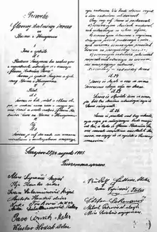 The first public assembly of workers in Bosnia and Herzegovina was held as planned, on 27 August 1905; it had around 350 participants. The provincial government sent an envoy to be present at this gathering. It was presided by Alojz Supančič (a textile worker, originally from Slovenia), and its minutes were recorded by Sokolović and Mustafa Handžić (a shoemaker).[7] The assembly accepted the proposition to found the General Workers' Union (Glavni radnički savez), the main goal of which was "to work on the intellectual, moral and material advancement of workers, to awaken their class consciousness, and to spread solidarity among them". The Rules of the General Workers' Union (Pravila Glavnog radničkog saveza), whose articles were composed by Sokolović, was also unanimously accepted. The assembly elected a provisional management of the organisation, with Ilija Kamber (a construction worker) as its president and Sokolović as its secretary.[9] It was the first trade union to be founded in Bosnia and Herzegovina.[6] Beside this general union, during September 1905 similar assemblies founded six trade unions organised along the lines of particular trades. All these organisations and their Rules had to be approved by the central Ministry of Finance in Vienna and the provincial government, which would take about a year.[10] A more lenient attitude of the Austro-Hungarian government toward workers' demands and organisations resulted partly from their fear that something similar to the Russian Revolution of 1905 might happen in their empire. They saw that further repressive measures against organised workers might lead to a serious social and political unrest, but they sought to make the worker's organisations apolitical and to place them under their control.[7]