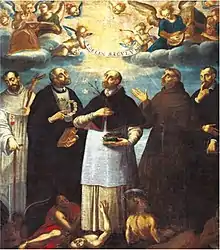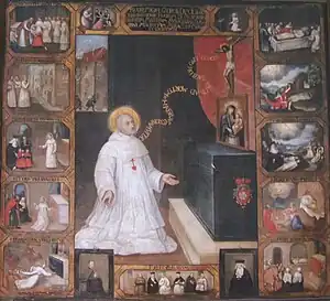 His tomb was reopened again on 4 June 1624 and his relics were translated to a new sarcophagus suitable for public veneration on 11 August 1625.[28] A late Renaissance tomb which survives to this day was built at the same time.[29] In 1624, a large painting was completed depicting key scenes from Giedroyć's life. The central part depicts the key miracle – the message from the crucified Jesus. In a window behind him, there are burning houses and people rushing away – a reference to the tradition confirmed by Miechowita that Giedroyć was a protector from fires.[30] Twelve smaller scenes illustrate episodes from his life on the left and miracles attributed to him on the right. These episodes include the miraculous rescue of the church of St. Mark from a fire, satanic torture that Giedroyć experienced during his prayers, and prophesying to city residents.[31] His posthumous miracles include the message delivered by Świętosław Milczący regarding the proper burial place for Giedroyć, healing of Katarzyna Rybarka (she was a possessed woman and it was the first recorded posthumous miracle attributed to Giedroyć), saving two young boys from drowning (a son of a Hungarian merchant who drowned in the Danube and a boy in the village of Spytkowice), and reviving a stillborn child. At the bottom, there are portraits of six other holy men who were Giedroyć's contemporaries in Kraków.[31]