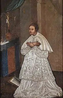 Giedroyć's burial in the presbytery might be an indication of plans for his beatification already at the time of his death.[2] However, the Protestant Reformation attacked the cult of saints and there were no new canonizations between 1523 and 1588.[35] Cardinal Jerzy Radziwiłł (1556–1600) investigated the possibility of his canonization.[4] The 1620s saw a surge in his veneration, but Pope Urban VIII issued a decree in March 1625 that codified rules of beatification and restricted certain signs of veneration or holiness (e.g. depiction of haloes) only to those who were officially beatified or canonized. In 1634, the pope further removed bishops' right to beatify people and reserved it to the pope. It is likely that Giedroyć's beatification efforts were abandoned because of these new rules.[26][36] His congregation, the Canons Regular of the Penitence, declined and was suppressed by the authorities of the Russian Empire in 1832.[37]