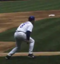 Barrett's long tenure with the Expos ended in December 2003. The team traded Barrett to the Oakland Athletics in exchange for minor league pitcher Brett Price.[19] The Athletics then traded Barrett to the Chicago Cubs for Damian Miller, only days after the initial transaction.[20] Barrett, who had just spent six days with three teams, shortly signed a one-year contract with the Cubs, which was worth nearly $1.55 million.[21] He first practiced with the Cubs during their annual spring training sessions, and reported receiving a cold reception from teammates.[22] Barrett went on to become one of their top hitters during the 2004 season. He played a crucial role in their wild card chase; Barrett maintained a .287 batting average and hit 16 home runs and 65 RBI during the 2004 season.[3] He finished the season as one of the league's top defensive catchers (fielding at a .994 clip with six errors),[3] and led the Cubs in triples and sacrifice flies.[23][24] Barrett was involved in two incidents with Houston Astros pitcher Roy Oswalt during the 2004 season. On August 22, Oswalt beaned Barrett.[22] Barrett, believing the pitch was a reaction to a three-run home run that Aramis Ramírez had previously hit, confronted Oswalt, and prompted both teams to take the field. Oswalt was ejected from the game, as the Astros went on to lose 11-6.[25][26] Five days later, during another Cubs-Astros game, Barrett mouthed off to Oswalt and attempted to confront him.[22] The game's umpires restrained the two before a fight could break out, but not before both benches cleared out.[26] Oswalt remained in the game, and defeated the Cubs 15-7.[27] In a post-game press conference, Barrett condemned Oswalt's actions, and stated, "We're going to see him again."[26]