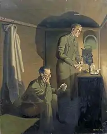 In May 1940, Ford joined the Local Defence Volunteers, which soon became the Home Guard and also worked three days per week as a coal miner whilst also doing farm work. He learnt to ride a motorbike and became a dispatch rider.[1] Ford continued to paint and submitted a number of pictures to the War Artists' Advisory Committee, WAAC.[4] The first to be accepted by WAAC was Home Guards Brewing Tea just before Dawn which Ford had first sketched in a shepherd's hut whilst waiting to go on Home Guard duty. A submission in May 1941 of a painting of a Land Girl was refused, but in July 1941 WAAC accepted War Weapons Week in a Country Town and included it in their ongoing National Gallery exhibition.[5] A reproduction of the painting was included in Eric Newton's 1945 book War Through Artists' Eyes.[6] Ford continued with his Home Guard duties and farm work and in February 1942 submitted another picture to WAAC. This oil painting, Italian Prisoners-of-war Working on the Land, was purchased by WAAC for fifteen guineas and was one of the few depictions of prisoners of war at work acquired by WAAC.[7][8] Ford also designed a poster featuring a Land Girl with the slogan "Are you working of shirking ? More women are needed".[1]