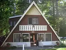 Constructed in either 1904 or 1909,[7][11] what would eventually become the main lodge was built as the vacation home of C. R. Stephens of Moline;[11] it was erected using balloon construction, along with a wooden truss roof and asphalt shingles. The four-story building, which the Stephens family christened "Lover's Lane,"[12] measured 13,000 square feet (1,200 m2) and, in its final configuration, featured 18 guest rooms as well as a kitchen and a pair of dining rooms with a capacity of 200.[8] In 1920, Whitehall resident Emanuel "Manny" Duttenhofer purchased this building, which was one of the two largest summer homes at Michillinda.[5] Initially, he intended to make it a summer retreat for his family, but after the unexpected death of his wife he instead used it to host friends and relatives. Shortly thereafter, he opened the building as a public resort and christened it the Michillinda Beach Tavern. In 1933, the resort was renamed Michillinda Beach Lodge to differentiate itself from alcohol-serving saloons, many of which renamed themselves "taverns" after the repeal of the Eighteenth Amendment to the United States Constitution. During their ownership, Duttenhofer and his sisters helped to develop Michillinda into one of the area's most frequented resorts, and the increased demand necessitated the construction of a two-story, 10-room Annex.[4]