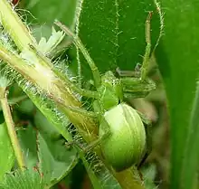 In the females of Micrommata ligurina the body length can reach 9–14 millimetres (0.35–0.55 in), while in the males it is about 6–9 millimetres (0.24–0.35 in).[4] The carapace is long and narrow and the abdomen is elongate. The cephalothorax and the long legs of the females are bright green, with a lighter green abdomen showing an almost indistinct median band.[4]