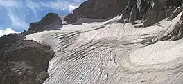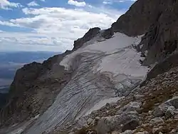Middle Teton Glacier is on the northeast flank of Middle Teton in Grand Teton National Park, Wyoming.[2] The alpine glacier is a popular mountaineering route for ice climbing and for access to the summit of Middle Teton and other peaks to the south. The glacier is at the west end of Garnet Canyon, which is the most popular route used by climbers ascending Grand Teton. The glacier melt feeds streams below including Spalding Falls, an 80 ft (24 m) high cascade. Between 1967 and 2006, Middle Teton Glacier lost approximately 25 percent of its surface area, shrinking from 52 to 39 acres (21 to 16 ha).[3]
