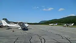 The aircraft parking aprons at the facility are approximately 87,000 ft2[4] and encompass approximately 170,000 ft2 of area.[5] The principal apron is located northwest of Runway 19 and has the capacity to hold 42 aircraft. The secondary apron is located in front of the terminal building and has the capacity for 10 aircraft. A small fueling apron is located between the two parking aprons. Aircraft tie-down spaces are leased by the facility's FBO from the State of Vermont.