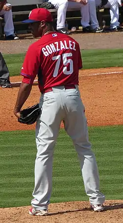 Entering spring training, it was still unknown whether he would be a member of the big league starting rotation, bullpen, or whether he would start the season with the Phillies Class AAA affiliate, the Lehigh Valley IronPigs.[10] Ultimately, he opened the season on the 60-day disabled list (DL) "after not exactly impressing in a poor spring";[11] the official reason for his placement on the DL was "right shoulder tendinitis".[12] Upon returning from injury, Gonzalez ascended through the Phillies' minor league system on a rehab assignment, compiling 54 strikeouts in 46+1⁄3 innings pitched. Used primarily out of the bullpen in his rehab stint, Gonzalez completed his minor league assignment with a 3.11 earned run average (ERA) and .231 opponent batting average. Deemed healthy and ready to begin his MLB career, Gonzalez was activated and assigned to the Phillies on September 2 as part of the roster expansion call-ups.[13] He recorded a 6.75 ERA in 5+1⁄3 innings pitched in the major leagues.[14]