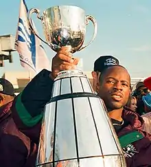 Pringle holding the Grey Cup, 1995