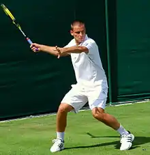 Youzhny began the 2003 season with a semifinal appearance at the Qatar Open in Doha, losing to American world number forty-two Jan-Michael Gambill.[16] Youzhny, who was seeded for the first time at a grand slam event, reached the fourth round of the Australian Open losing to world number nine Andy Roddick in five sets after failing to close out the match with a two-set lead.[17] After this defeat Youzhny fell in the first or second round five consecutive times.[16] At the BMW Open in Munich, Youzhny reached the quarterfinals but lost to world number five Roger Federer.[16] At the Hamburg Masters, Youzhny reached the third round by defeating world number ten Jiří Novák in straight sets before losing in the third round to Argentine world number sixteen Guillermo Coria.[16] At the French Open, Youzhny was seeded number twenty-seven, and for the first time in his career he won his first round, but lost in the second round to Attila Sávolt, world number 141 from Hungary, in a five-setter.[16] At the Gerry Weber Open in Halle, Germany, Youzhny reached the semifinals, but lost to Roger Federer.[16] At Wimbledon Youzhny was seeded 16th, and lostfor the first time in his career before the fourth roundto Spain's Feliciano López, ranked number fifty-two in the world, in the second round.[16] Youzhny immediately recovered from his defeat to reach the quarterfinals of the Synsam Swedish Open in Båstad, Sweden, but lost in the quarterfinals at the MercedesCupin which he was the defending championto world number seven Guillermo Coria.[16] At the Western & Southern Financial Group Masters in Cincinnati, Youzhny lost for a third consecutive time to Corianow ranked world number five.[16] At the US Open he continued his poor form by losing in the first round to world number sixty-four Antony Dupuis from France.[16] However, he reached the semifinals of the Grand Prix de Tennis de Lyon in Lyon, losing to world number six Rainer Schüttler from Germany.[16] At his next tournament, the St. Petersburg Open, he reached the quarterfinals but lost again to Schüttler, this time in straight sets.[16] He ended the season with 29–27 win–loss record,[16] making it his worst season since 2001,[7][9][12] and ended the year ranked world number forty-three.[6]