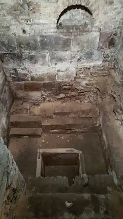 The remains of a staircase of grey and pink sandstone remain visible at the mikvah. The staircase led from the entrance of the bath, at the basement level of the building, down to the water table. The last step of the staircase opens to the bath itself. Part of the steps in the staircase were reused in the construction of a well following the departure of the Jews from the building.