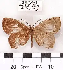 A small butterfly, 32 to 38 mm in wingspan. The upper forewing in both sexes has an obscure narrow curved white discal band, the lower spots composing it are well separated. In males, this band may be reduced to a small whitish patch at base 4. In females there will always be a dark streak present in the cell while the band may coalesce and extend to base.[4] The body of the male is elongated and slender and protrudes beyond the wing. The underside is white with fine brown striation.