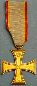 DescriptionBronze gilt cross pattée; 1st Class is a pinback decoration, 2nd Class is worn from a ribbon