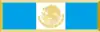 Description: Round gilt medal with outer rim formed by a wreath of laurel enclosing inner beaded, raised rim; center bears 10-rayed Aztec style "sun wheel" with Toltec pyramid inside, above inscription Servicios Distinguidos. Suspended by a small Mexican eagle from a ribbon of three equal light blue-white-light blue stripes with a gilt bar at top inscribed, Mexico.