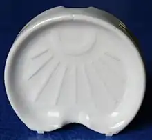 A milk watcher is a disk with a raised rim notched on one side. Some milk savers are designed so they can be used with the obverse or reverse side facing up and appear to have two notches. The interior of the disk slants upward toward the notched side, creating a space just behind the notch where water vapor can collect. Water vapor trapped under the milk saver causes the notched side to rise up, releasing the water vapor and making a rattling noise as the saver falls back into contact with the base of the pan.[1][2]
