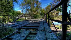 Mill Creek Bridge is a historic structure located in a rural area north of Clarence, Iowa, United States.The Cedar Bluff Bridge over the Cedar River was the first all-iron span built in Cedar County in 1877. Four more iron spans were built later that year, as were several others over the years before this bridge was completed in 1889. It is the only one of those bridges left, and one of the oldest pony truss bridges in the state of Iowa.[2] Citizens in Dayton Township petitioned the Cedar County Board of Supervisors in June 1888 for the bridge over Mill Creek. The supervisors contracted with Ward and Keepers of Clinton, Iowa to design and build the bridge. The 58-foot (1,800 cm) span was built on concrete-filled iron cylinder piers, with timber stringer approach spans.[2] Over the years sub-structural alterations have been made to the bridge. It has subsequently been abandoned and its deck is in a deteriorating condition. The bridge was listed on the National Register of Historic Places in 1998.[1]