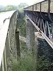 A local landmark is the viaduct, first built by the Midland Railway in 1866. Increasing traffic meant that a second viaduct parallel to the first was built in 1905, increasing the number of tracks to four. Millers Dale station was at the junction where passengers for Buxton joined or left the trains between London and Manchester. The station closed in 1967 and the line closed in the following year. Large sections of the trackbed now form part of the Monsal Trail, a cycle and walking trail.[2][3]