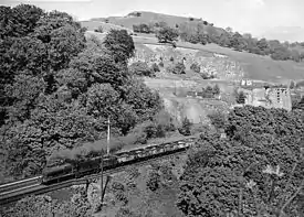 To the west of the station, the line crossed the River Wye three times and ran through the 401 yards (367 m) and 94 yards (86 m) Chee Tunnels and the 121 yards (111 m) Rusher Hall tunnel, before reaching the New Mills line junction (officially Millers Dale Junction), 1.25 miles (2.01 km) from the station.[12]