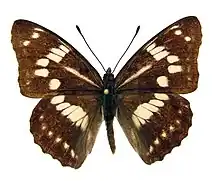 A. nycteis Men. (51c) has less elongate wings than the preceding species [Chitoria ulupi|A. fulva] , differing very considerably from the same, resembling certain species of the genus Athyma on the upperside, especially in the cell of the forewing bearing a white longitudinal streak along the median vein. Underside violet-brown, with the markings of the upperside reappearing, but partly widened and of a white colour which has almost a mother-of-pearl gloss; in the basal area of the hindwing there is anteriorly a long curved white spot, between the middle band and the submarginal row of spots there is a row of bluish white spots in the dark ground-colour. Female similar to male larger, rarely with a row of red-brown spots near the outer margin of the hindwing. An apparently rare form of this species is ab. cassiope Men. (51c), in which the white spots in the central area of the forewing are so much enlarged as to form an almost continuous, broad, strongly curved band; the middle band of the hindwing, too, is essentially dilated. Larva slug-like, dark green, laterally with light oblique stripes, segments 6—12 each with 2 thorny processes, those on segments 6, 8 and 11 being longer and thicker than the others, at the apex of the body 2 long, pointed processes; on the head 2 long thorny horns, which terminate each in 2 roundish knobs directed forward; head and back with single small short thorns, which are longest on the sides of the head, where they also stand more closely together; the parts of the body ventrally of the spiracles clothed with minute yellowish hairs; ventral surface paler than the back; length of the adult larva 52 mm. In June on Elm. Pupa whitish green like that of ilia and iris, but bearing a row of obtuse tubercles on the sharply keeled dorsal side of the abdomen (according to Graeser). — Amurland, Ussuri, Sutchan, Corea.[2]