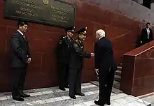 The Ministry was formed from the headquarters of the 17th Army Corps, after the dissolution of the Soviet Union in 1991-92. Originally, it was named the State Defense Committee, by order of President Askar Akayev on January 13, 1992. In 1993, the State Defense Committee was renamed to the Ministry of Defense of the Kyrgyz Republic. In November 2015, the Ministry of Defense was renamed the State Committee for Defense Affairs.[2][3] In 2018, the Jogorku Kenesh raised the issue of restoring the Ministry of Defense, with Deputy Almambet Shykmamatov saying that Generals of the General Staff are not recognized abroad, since in other countries this body is "just an office" that coordinates the work of different agencies.[4] Following the inauguration of President Sadyr Japarov in early February 2021, the Ministry of Defense was reestablished.[5][6][7] This came after a poll appeared on the General Staff's Facebook page asking whether citizens consider it necessary to re-create the ministry, with the majority supporting the idea.[8]