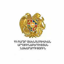 The Ministry of High-Tech Industry (Armenian: Բարձր տեխնոլոգիական արդյունաբերության նախարարություն) is a ministry of the Armenian government, headquartered in Yerevan. The Ministry of High-Tech Industry is a central body of executive authority that develops and implements the Armenian government's policy in the spheres of communication, information, information technology and information security, postal services, licensing, granting of permits and military industry.[1] The current Minister of High-Tech Industry is Robert Khachatryan.