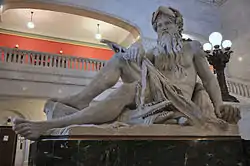 Inside, on the 4th Street side, there is a large five-story rotunda including a large sculpture, "Father of Waters," by American sculptor Larkin Goldsmith Mead who lived in Florence, Italy at the time. According to legend, rubbing his big toe brings good luck. It was placed inside the building in 1906. Originally, the building had a red terracotta roof, but it began leaking so a copper roof was installed. At 180,000 pounds (81.6 t), it was said to be the largest in the country. The copper has since acquired its characteristic green patina.