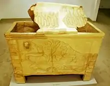 Larnakes are pottery sarcophagi modelled on similar coffins in wood and were a standard part of Late Minoan funerary practices.[1] Too small for bodies, they were used as "ash-chests" after cremation. The Hanover larnax survives largely complete except for the fragmentary lid. Missing portions, especially on one of the short sides, have been reconstructed in modern times. The remains of the lid have been connected together and partially restored. The lid is decorated with two bands of waves, one on top of the other. The lid has the form of a pitched roof, flattened where it meets the edge of the sarcophagus, so that it sits firmly on the sarcophagus.