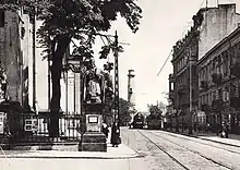 The present-day territory of Mirów was once occupied by a jurydyka called Wielopole,[1] a self-governing town and exclave of Warsaw, just outside the city's borders.[2] By the 18th century, the town lost its independent status and was incorporated into the city limits.[3] The area was named after William Mier, a Scottish officer in Polish service and the commanding officer of the Horse Guard of the Polish Crown Regiment stationed in what became known as the Mirów Barracks.[4] The barracks and stables were completed in 1732.