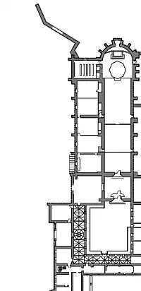 The floor of the church is formed by a single quadripartite longitudinal nave, distinguishing the spaces of the chancel, the choir of the Fathers, the choir of the Brothers and the faithfuls stay. The nave is closed with vaults with tiercerons, keeping the Gothic original layout.