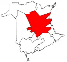 Miramichi—Grand Lake was created by the 2012 federal electoral boundaries redistribution and has been legally defined in the 2013 representation order. It came into effect upon the call of the 42nd Canadian federal election, scheduled for 19 October 2015.[2] The riding succeeded the Miramichi riding (83%), and incorporated small portions of Fredericton (10%), Beauséjour (6%), and Tobique—Mactaquac (1%).[3]