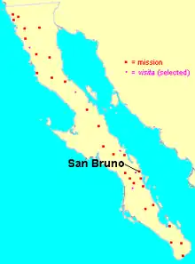 Location of Mission San Bruno among the Spanish missions in Baja California