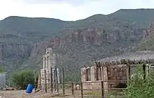 The mission took advantage of an existing spring to sustain the settlement, and created reservoirs[7] and an irrigation ditch (sometimes called an acequia or zanja) "in many places as much as six feet deep...cut in the sandstone to conduct water from a spring several hundred yards above the mission" to water fields and orchards.[8] Writing in the mid-20th century, Homer Aschmann said the spring had failed but parts of ditch remained visible.[8] However, researchers in 2013 found that the Santa Gertrudis spring had a "steep, short descent" in relation to the rest of the watershed in the immediate area.[3] The spring, in combination with the water-management structure and the imported perennial food species introduced during the Jesuit–Dominican–Franciscan mission era from 1751 to 1822, continue to support an agroforestry system populated by a diverse array of perennial food plants.[4] The 1990 SDSU assessment found the historic water system "to be in miserable shape" with the oasis pools heavily damaged by livestock.[7]