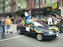 Miss Foozie rides in the back of a car during the 2007 pride parade in Chicago, Illinois.[20]