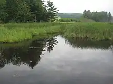 It flows west through northern Franklin County approximately 10 miles (16 km) south of the Canada–US border, past the small communities of Richford, East Berkshire, Enosburg Falls, and Sheldon Springs. On the west side of Interstate 89 in northwestern Franklin County, it turns to the north, passing through Missisquoi National Wildlife Refuge in its lower 5 miles (8.0 km) before entering the south end of Missisquoi Bay, an arm of Lake Champlain that straddles the Canada-Vermont border. In the last segment of 5.6 kilometres (3.5 mi) (ie from Dead Creek) in Swanton, the Missisquoi River crosses a large area of marsh located on a peninsula (stretching over 4.2 kilometres (2.6 mi)) westwards and having a width of 7.2 kilometres (4.5 mi)).[3]