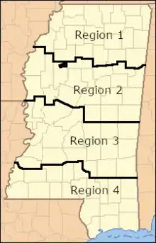 There are four administrative regions in Mississippi. Each region is staffed by a Regional Forester, with either 6 or 7 Area Foresters assigned to individual regions.[10]