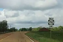 MS 792 is located in southern Lowndes and northern Noxubee counties.[2] In 2012, Mississippi Department of Transportation (MDOT) calculated as many as 1,800 vehicles traveling west of Trinity Road and Weyerhaeuser Road, and as few as 540 vehicles traveling south of Bluitt Road.[3] The route is legally defined in Mississippi Code § 65-3-3,[4] and is maintained by the Mississippi Department of Transportation.[1]