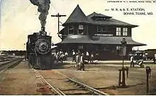 The Mississippi River & Bonne Terre Railway (M.R. & B.T.) was a single-track standard-gauge steam railroad that was located in southeastern Missouri and began service in 1892. It extended from Riverside in a general southwesterly direction to the lead-mining field in St. Francois County. The main stem, from Riverside to Doe Run, was 46.492 miles (74.822 km) long. Eight short branch lines had a total trackage of 17.418 miles (28.032 km). Sidings and spurs aggregated 30.664 miles (49.349 km), and all tracks owned 94.574 miles (152.202 km).[1]