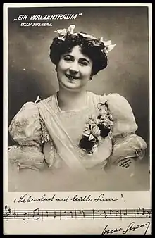 Her father Karl Ludwig Zwerenz (30 September 1850 in Vienna; 28 December 1925)[1] was an actor and director, as well as director of theaters in Bolzano, Merano, Bucharest, Teplice, Iglau, Pressburg and Bad Hall. Her mother, Eveline Zwerenz (* 1842 – February 1921 in Vienna), worked at the Stadttheater in Baden bei Wien from 1888 to 1891 and 1893 to 1903.[2] Her grandfather Karl Zwerenz (1826-1898) and her great-grandfather Karl Ludwig Costenoble were Hofburg actors. For now, she did not want to follow in the footsteps of the family. Then she followed the tradition, took lessons and made her debut in Baden bei Wien.[3] She played in Bielitz, at the summer theater in Mödling, toured with the Wiener Soubrettenensemble in Russia, in Friedrich-Wilhelmstädtischen Theater in Berlin and sang between 1901 and 1920 in the Carltheater in Vienna.[4] At the Viennese Apollo-Theater, Zwerenz was a major force. In the early 1920s, she ran the Mizzi Zwerenz establishment in Baden,[Anm. 1] for which she collaborated with popular actors (including Fritz Imhoff).[5] In addition to her stage work, she appeared in several films, including Die kleine Veronika (1929) und Walzer um den Stephansturm (1935).