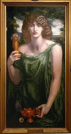 Mnemosyne, also titled Lamp of Memory and Ricordanza, is an oil painting by Dante Gabriel Rossetti begun in 1875 or early 1876 and completed in 1881. Jane Morris was the model, and Frederick Richards Leyland bought the painting in 1881 and displayed it in his drawing room with five other Rossetti "stunners."[1][2] At about the same time Rossetti, a founder of the Pre-Raphaelite Brotherhood, was painting Astarte Syriaca, a larger painting completed in 1877 with Morris in a very similar pose.
