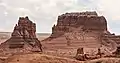 Mollys Castle is a geological feature set within the San Rafael Desert on the southeastern edge of the San Rafael Swell. This erosional remnant is composed of Jurassic rock. The thin, light-colored layer on top is Curtis Formation caprock, overlaying darker, reddish Entrada Sandstone, which is also the composition of the hoodoos that give Goblin Valley its name.[4][5]