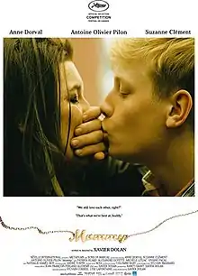 The film premiered on 22 May 2014, at the Cannes Film Festival, concluding with a 13-minute standing ovation.[14] The film opened in Montreal on 8 September,[9] and in Toronto on 3 October.[15] In France, the film was distributed by Diaphana Films, with associate company agnès b. selling Mommy necklaces to promote the film.[16] The film's U.S. distributor Roadside Attractions waited until 2015 for its release.[16]