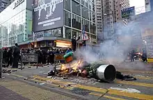 At 4 am, the first of multiple fires was started in Sai Yeung Choi Street South, followed by three more ignited in the same street.[30] Some protesters set fire to rubbish bins surrounding Shantung Street and Soy Street, including the junctions of Fife Street and Portland Street and of Nathan Road and Nelson Street, these were put out by the police and firemen.[31] Both lanes of Nathan Road were blocked from south of Argyle Street and the Mong Kok MTR station was shut down.[10]