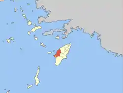 Monolithos (yellow dot) within Attavyros municipal unit (red)