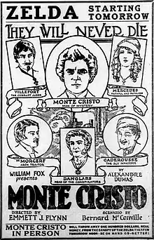 Monte Cristo is a 1922 American silent drama film produced and distributed by Fox Film Corporation and directed by Emmett J. Flynn. It is based on the 1844 novel The Count of Monte Cristo by Alexandre Dumas, which was adapted by 19th century thespian Charles Fechter and written for this screen version by Bernard McConville. John Gilbert plays the hero with Estelle Taylor as the leading lady. This film was long thought lost until a print surfaced in the Czech Republic. The film has been released on DVD, packaged with Gilbert's 1926 MGM film Bardelys the Magnificent.[1][2][3]